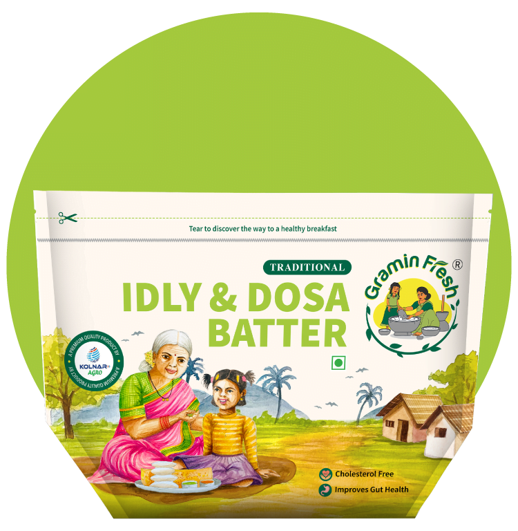 Gramin Fresh batters are made using traditional stone grinding methods and natural ingredients, ensuring authentic South Indian flavors. Our batters undergo a natural fermentation process to enhance texture and taste without any artificial additives or preservatives.