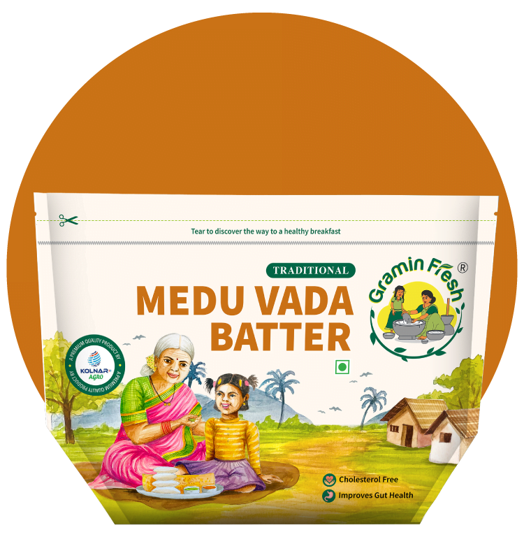 Gramin Fresh batters are made using traditional stone grinding methods and natural ingredients, ensuring authentic South Indian flavors. Our batters undergo a natural fermentation process to enhance texture and taste without any artificial additives or preservatives.